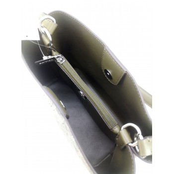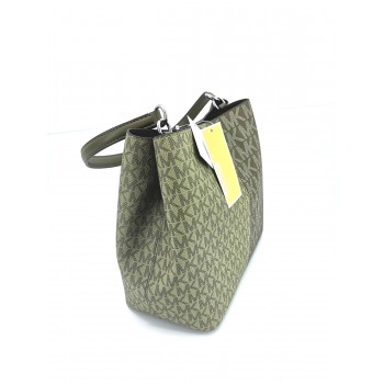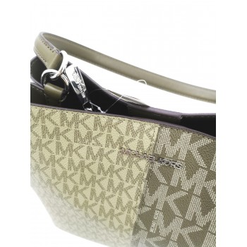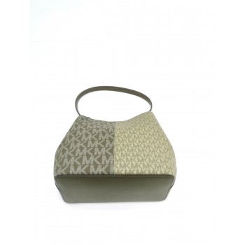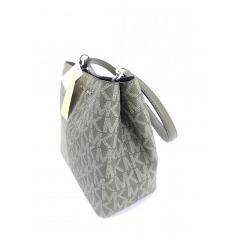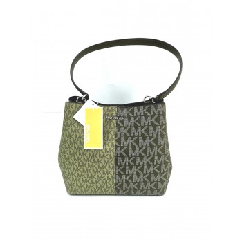 Este elegante Bolso de hombro Pratt mediano de Michael Kors destaca por su silueta atemporal inspirada en las bomboneras (bucket bag). Está confeccionado en una mezcla de lona revestida verde oliva y khaki con ribetes a juego y apliques metálicos en tono plateado, lo que le confiere una gran durabilidad y un acabado lleno de textura.