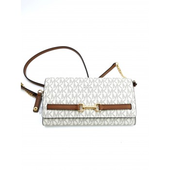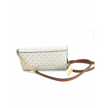 Exclusivo bolso de la firma Michael Kors que destaca por su versatilidad y diseño multifuncional. Confeccionado en la icónica lona con el estampado de logotipos "Signature" de la marca, este modelo combina los tonos vainilla clásicos con elegantes detalles en piel.