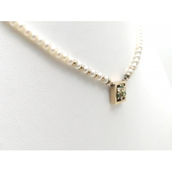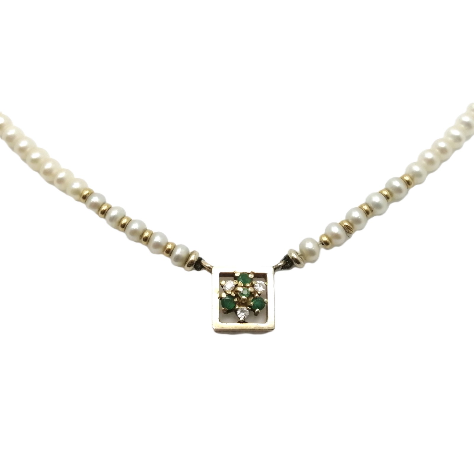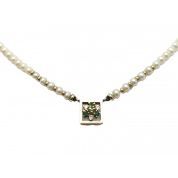 Se vende collar de Perlas y oro amarillo de 18 quilates semihueco con Diamantes y Esmeraldas de segunda mano.