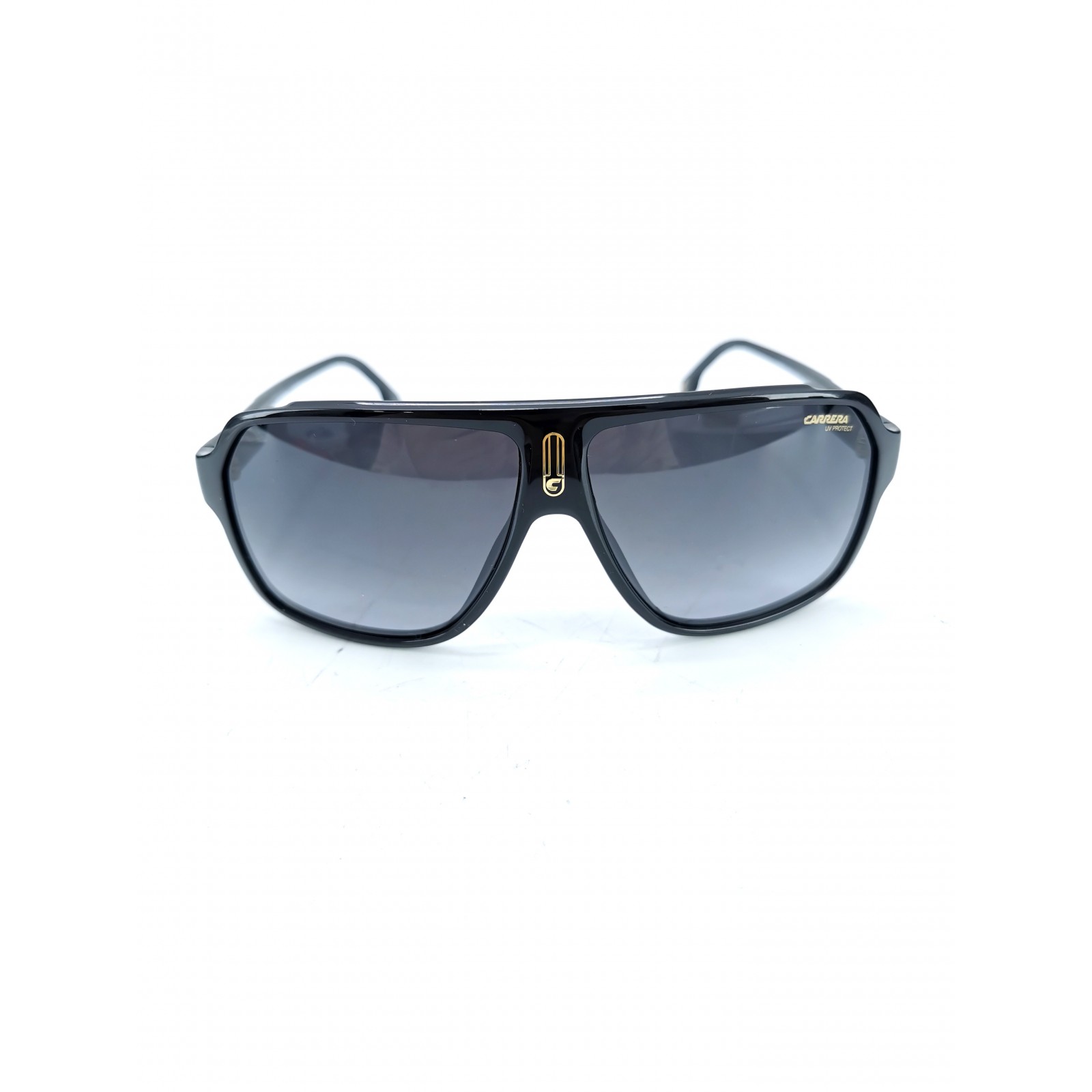 Impactantes gafas de sol de la firma Carrera que fusionan el diseño deportivo retro con una estética urbana de lujo. Este modelo se distingue por su montura de estilo máscara con una llamativa barra superior y el inconfundible logotipo de la marca en el puente, rindiendo homenaje a la herencia automovilística de Carrera.