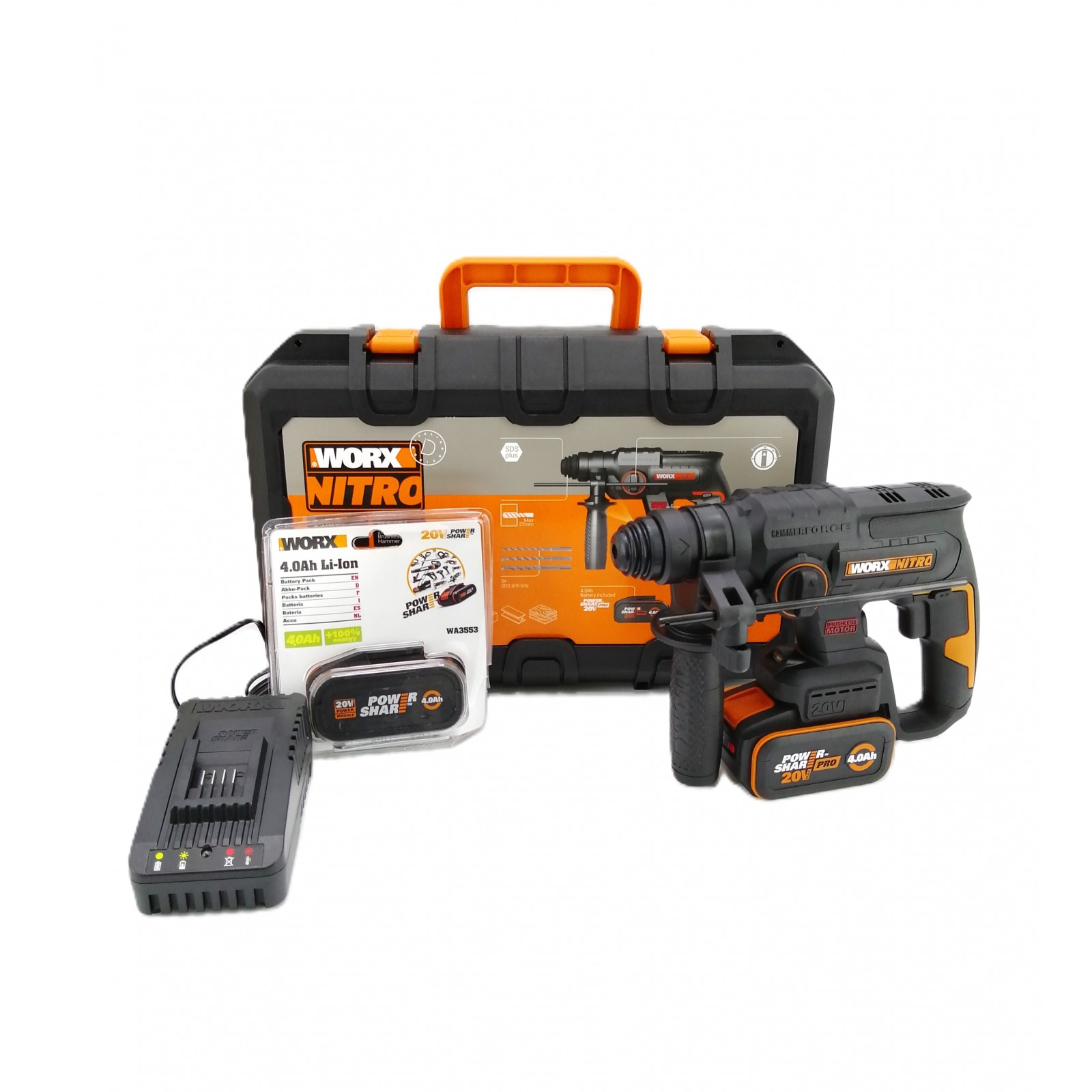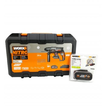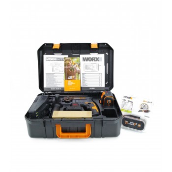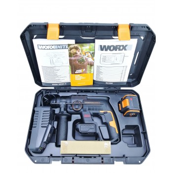 El Martillo Perforador WORX WX381 con motor sin escobillas (Brushless). Ofrece 2.0 J de energía de impacto y sistema SDS-Plus, ideal para trabajos de perforación y cincelado en hormigón (hasta 22 mm). Este modelo cuenta con 4 funciones en 1 para máxima versatilidad.