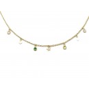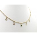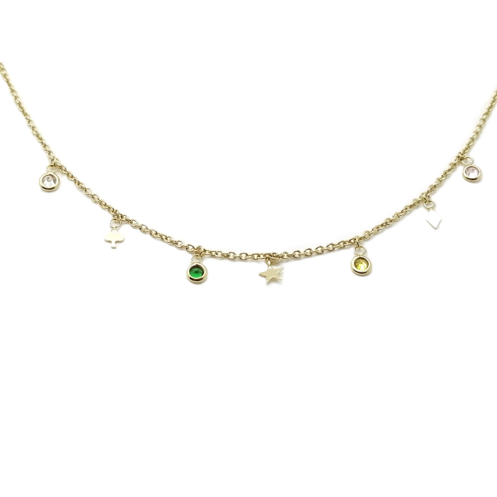 Con 4 colgantes de circonitas de colores y 3 colgantes en forma de estrella, pica y rombo.