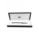 Artículo de escritura elaborado en resina preciosa color burdeos con el emblema Montblanc blanco incrustado en la cúspide del capuchón. Tres anillos chapados en oro con la marca Montblanc repujada. Clip chapado en Oro con número de serie individual. Capuchón con sistema cierre a presión. Longitud: 136 mm.