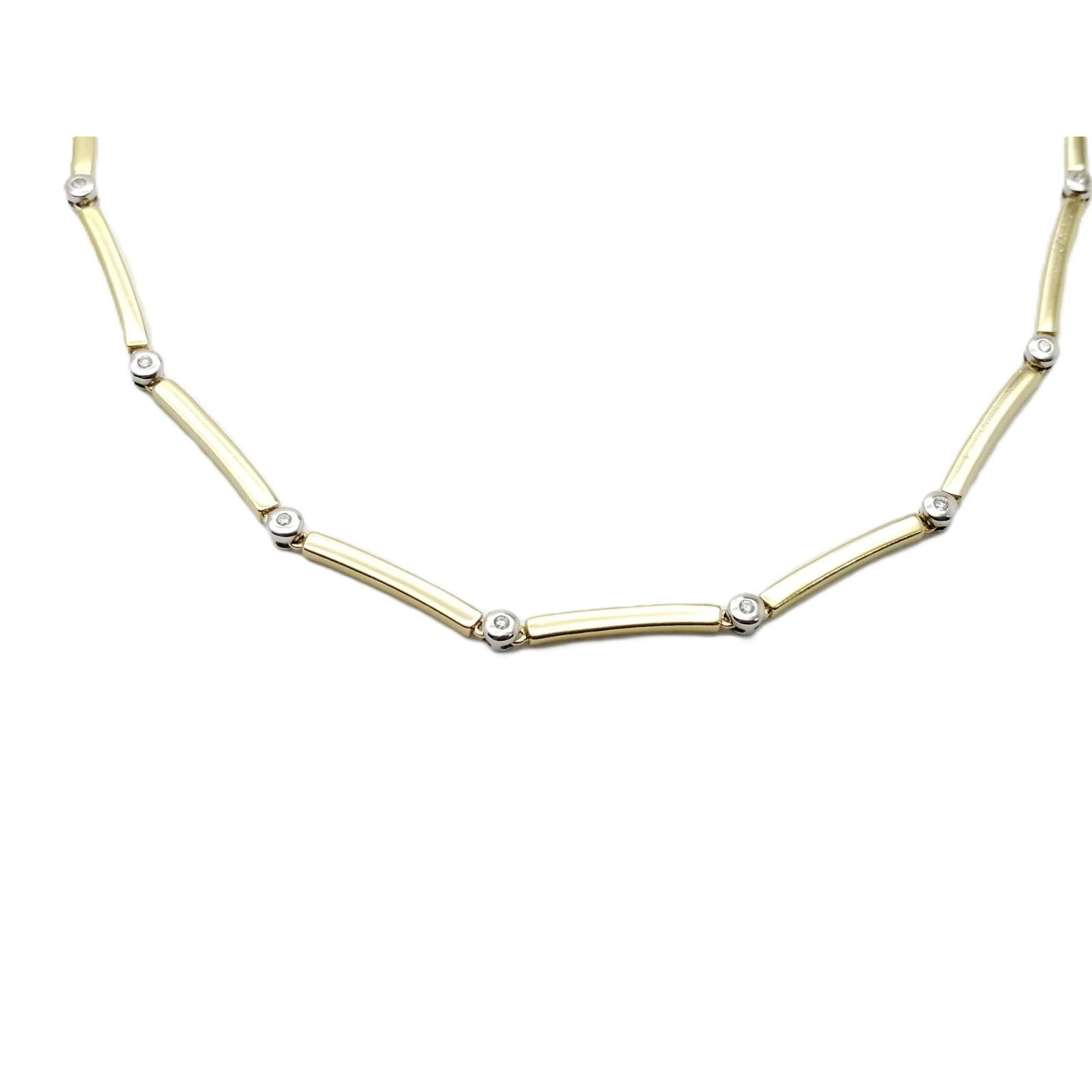Se vende cadena tipo gargantilla de oro amarillo de 18 quilates maciza con Diamantes de segunda mano10 Diamantes de talla brillante . Calidad: SI - J de 0.15 Ct. aproximadamente.Peso: 20.4 gramos. Longitud: 42 cm. Anchura: 3.8 mm. Grosor: 2.2 mm. Cierre: Mosquetón. Tipo de eslabón: Alterno. Joya de oro de segunda mano en perfecto estado sin marcas de uso (ver fotos).1 año de garantía.¡Reserva ahora con facilidad eligiendo nuestro "Pago a Plazos" y disfruta de la comodidad y flexibilidad financiera que necesitas!Consúltanos en cualquiera de los canales habituales.Envíos en 24h.Código interno: 112277