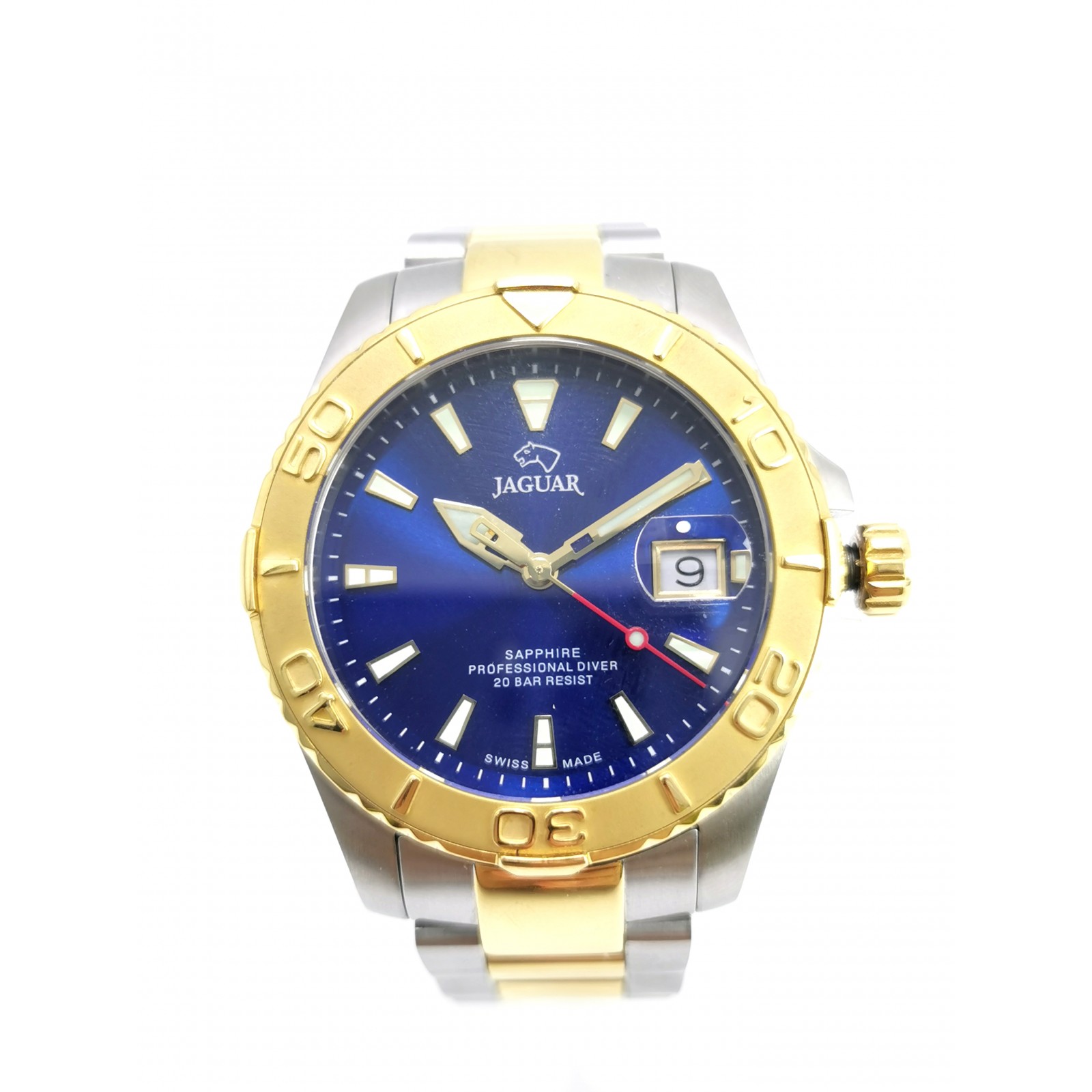 SE VENDE: Reloj Suizo de Hombre Jaguar Couple Diver Azul J970/2 ????Descubre la combinación perfecta de elegancia y robustez con este reloj de buceo Jaguar Couple Diver, un auténtico "Swiss Made". Este modelo presenta una llamativa esfera azul y un diseño bicolor en el brazalete de acero, que mezcla el plateado con detalles IP dorado, ofreciendo un estilo sofisticado y deportivo.Detalles del Artículo:Marca: Jaguar Modelo: Couple Diver Azul J970/2Movimiento: CuarzoCaja: Acero Inoxidable (40 mm)Cristal: ZafiroResistencia al Agua: 200 m (20 ATM)Longitud máx pulsera: 19cm.Estado: bueno, tiene marcas en la pulseraGarantía 1 añoEnvíos 24 hsCódigo interno:114385